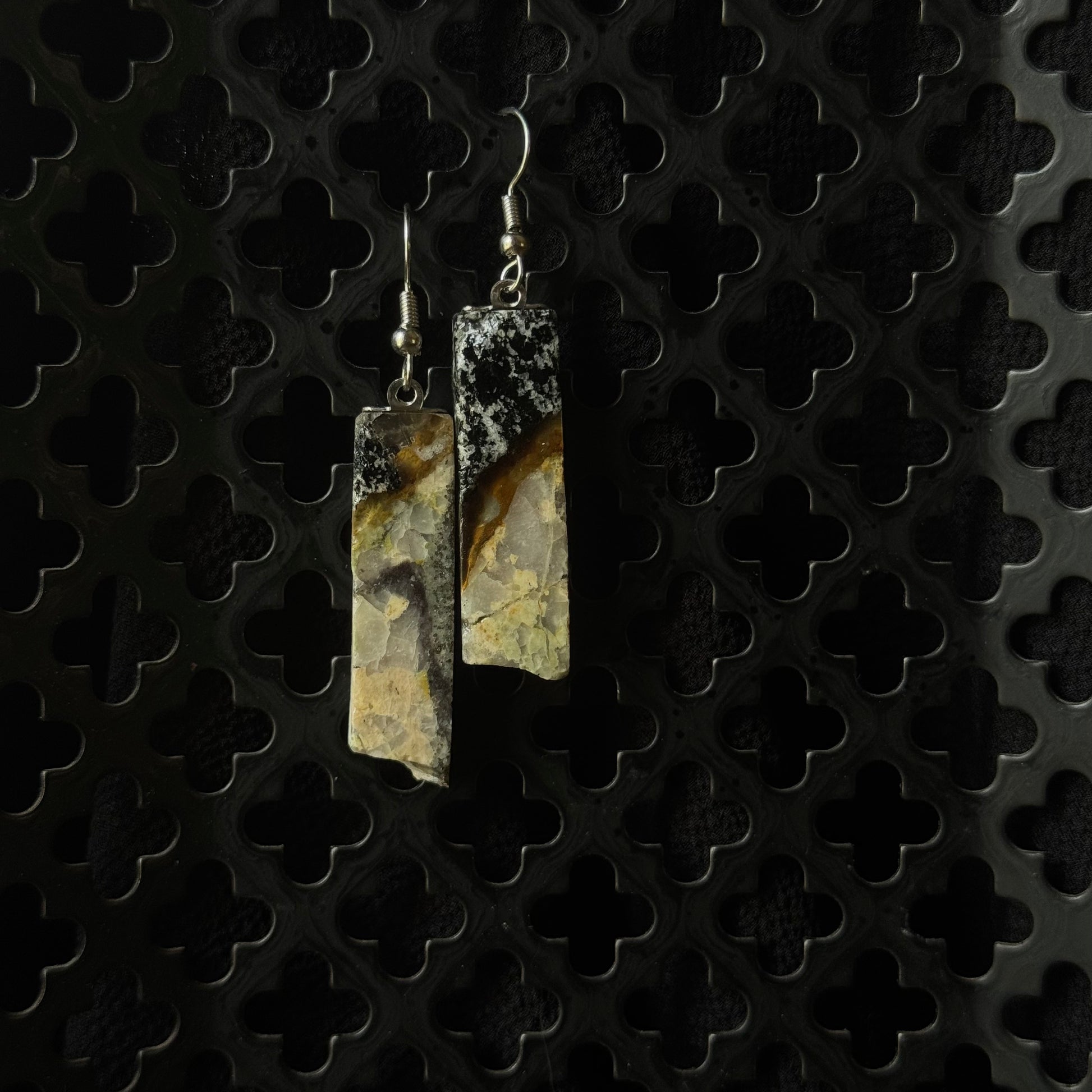 Sourced from the historic tailings of the King Monarch Gold Mine along Gamble Gulch Road near Black Hawk, Colorado, these earrings shimmer with the metallic brilliance of natural pyrite. Known as “Fool’s Gold,” each stone carries a golden luster that recalls the rich mining heritage of the Rockies. Set in resin, the raw, geometric sparkle of pyrite transforms into a bold, eye-catching piece of wearable history.